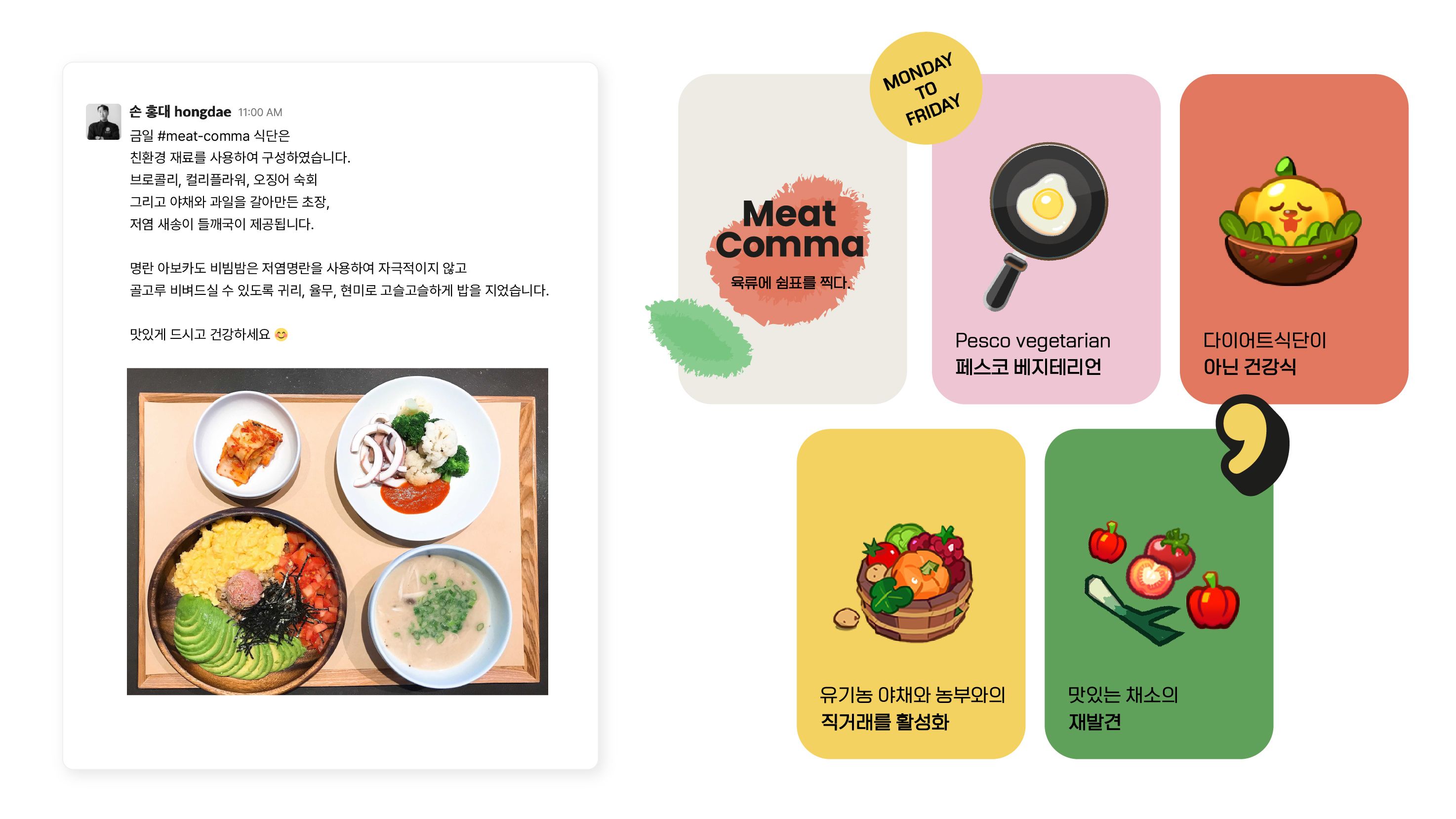 야채보다는 육류의 맛에 익숙해진 구성원의 기호를 사로잡고 건강식 또한 맛있고 의미 있게 즐길 수 있다는 것을 널리 알리려고 다양한 프로젝트가 진행되기도 합니다. 우리 몸에 쉬는 시간을 주자는 의미의 <미트콤마>가 대표적인 예인데요. 육류를 제외한 난류, 유제품, 어류를 사용해 다채로운 식재료를 조합하고 풍미를 극대화하는 조리 방법으로 맛의 궁합을 멋지게 선보입니다.